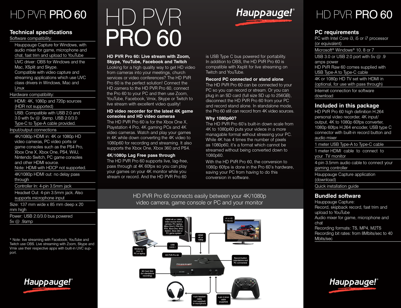 The HD PVR Pro 60 supports live, lag-free, pass through 4K 60fps in and out so you can play your games on your video monitor in 4K while you stream or record. And the HD PVR Pro 60 is USB Type C bus powered for portability.